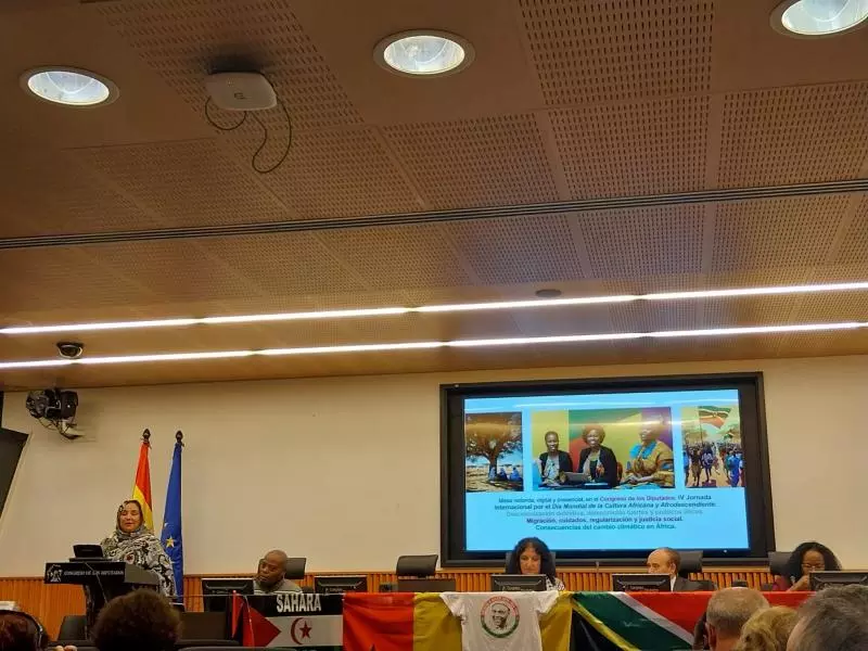 وأبرزت الدبلوماسية في مداخلة لها في الحلقة الرابعة لليوم العالمي للثقافة الأفريقية تحت عنوان” تصفية الاستعمار، الديمقراطية الحقيقية والحكومات الرشيدة” التي نظمت في مقر البرلمان الاسباني نضال افريقيا من أجل الحرية والتخلص من الهيمنة والاستعمار بشكليها القديم و الجديد وما قام به المغرب كقوة احتلال في الصحراء الغربية و ممارسة العنصرية ضد المهاجرين الأفارقة ومخالفته للأعراف والقوانين الدولية و الأخلاقية.